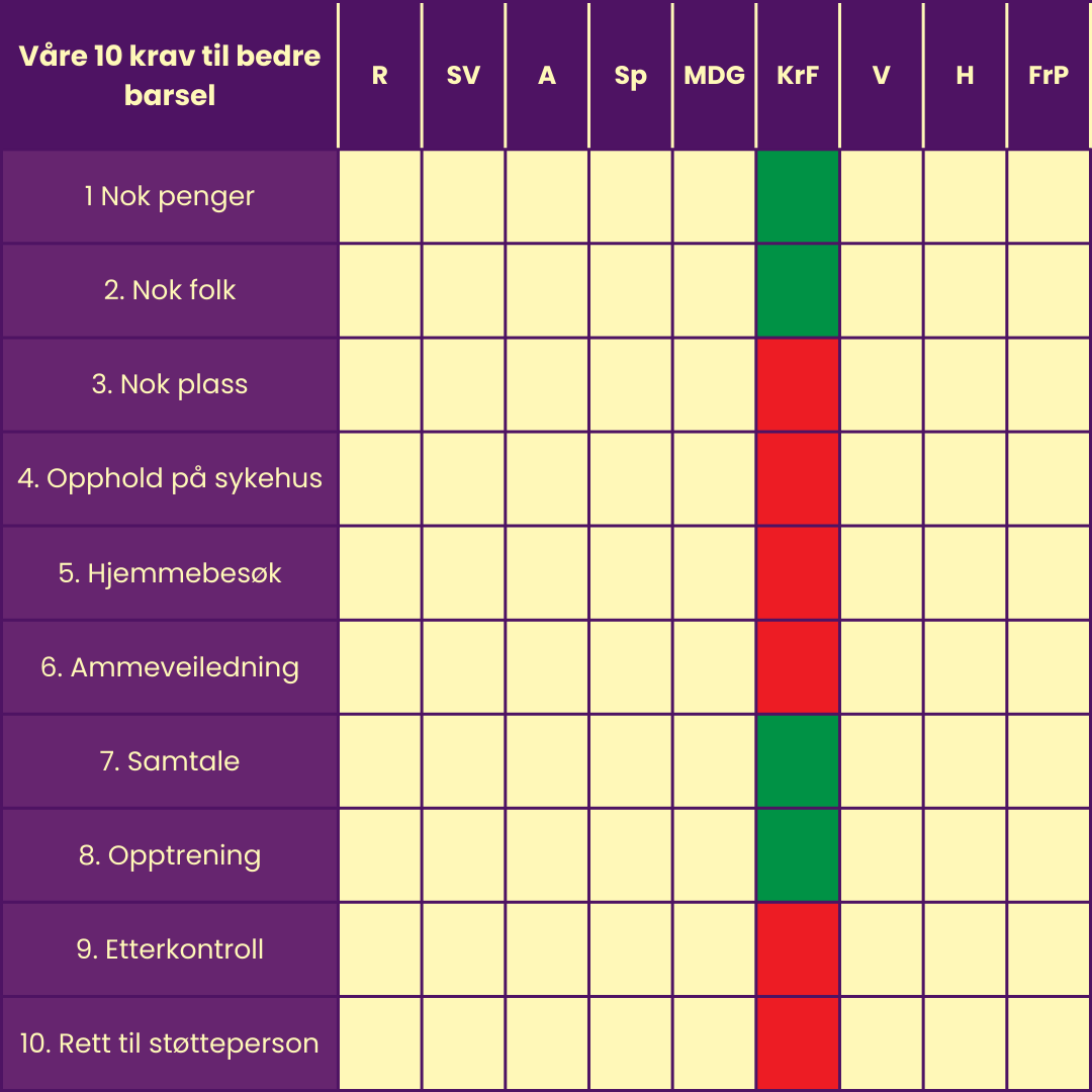 en oversikt over hvilke av våre 10 krav til bedre barsel som partiet har politikk på i sitt program