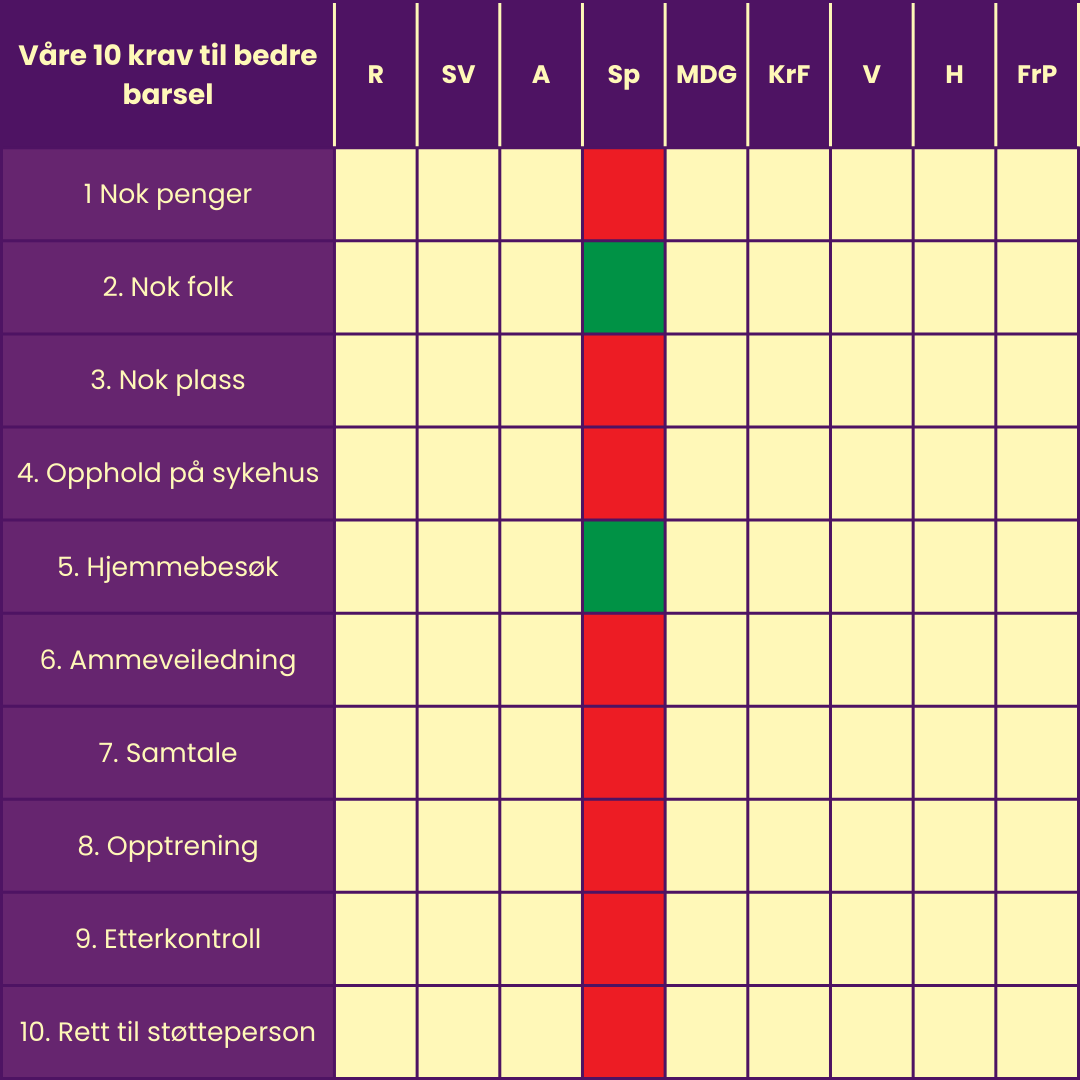en oversikt over hvilke av våre 10 krav til bedre barsel som partiet har politikk på i sitt program